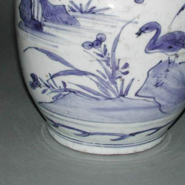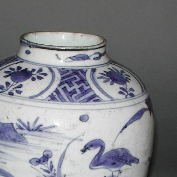 细节:罐身主体以青花绘有水禽、水草、山石等图案,水禽姿态各异,或栖息于山石之上,或在水草间活动,生动地展现了自然场景。颈部和肩部饰有辅助纹饰,如几何纹、花卉纹等,增加了装饰的层次感和丰富性。