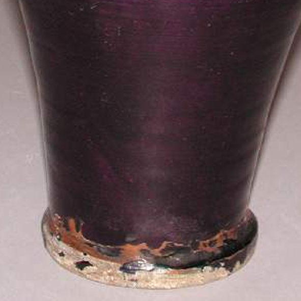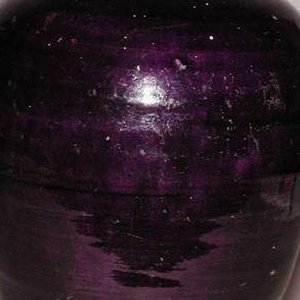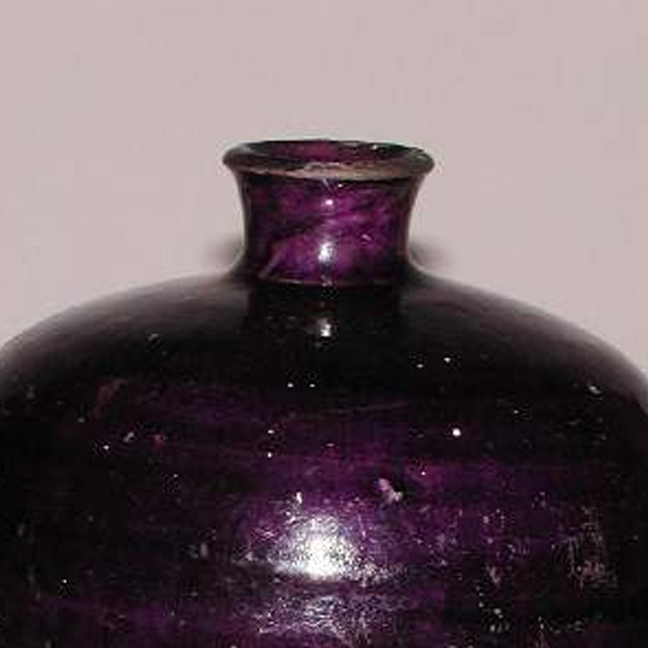 材质与色泽:胎体为瓷土烧制,质地较为细腻。瓶身通体施紫釉,釉色深沉浓郁,呈现出深邃的紫色,具有一定的光泽度,因年代久远和烧制工艺等因素,釉面有一些细微的开片和斑驳痕迹,底部圈足处可见胎体原色,且有磨损痕迹 。