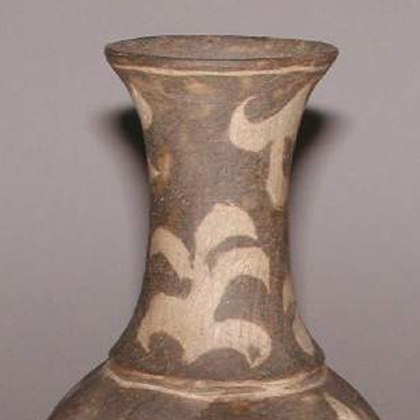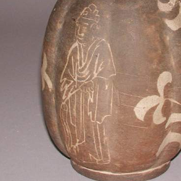 细节:瓶身刻绘有人物形象,人物身着长袍,姿态端庄,周围还点缀有花叶等纹饰,颈部也有简单的花叶纹装饰,纹饰线条简洁流畅,刀法娴熟,体现了宋代磁州窑工匠的高超技艺。器物表面有一些自然的磨损和污渍,增添了岁月的痕迹。