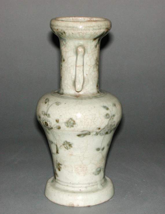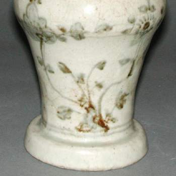 细节:瓶身绘有花卉纹饰,花朵、枝叶线条简洁流畅,富有动感。耳部造型简洁,与瓶身衔接自然。器物表面因年代久远,有一些细微的磨损和污渍,增添了岁月的痕迹。