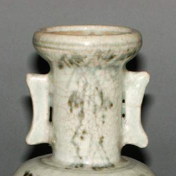 整体造型:瓶身为侈口,长颈,颈部两侧有对称的耳状装饰(若耳为管状贯穿,可称贯耳 ),溜肩,鼓腹,腹下渐收,圈足。整体造型规整,线条流畅,具有一定的庄重感。
