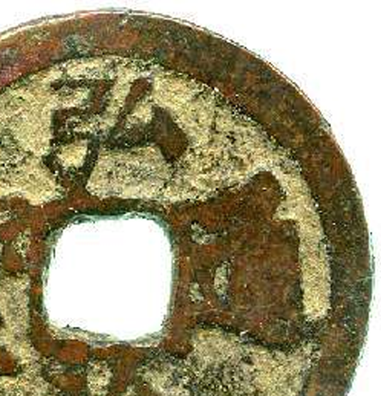 细节:正面铸有 “弘光通宝” 四字,字体为楷书,笔画较为规整,但由于年代久远和使用磨损,部分字迹略显模糊。背面从图片看为光素无文,弘光通宝版别较多,有些背面会有文字、符号等标记 ,用来区分铸造地等信息。