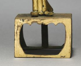 本品规格为高度14.9厘米,底座3.6 x 5.2 x 3.9 厘米。整体造型为僧人站立之姿。佛像以铜为材质,表面鎏金,虽部分鎏金已脱落,仍能看出昔日的华贵。僧人头部光素,面容平和,身着长袍,衣纹简洁流畅,双手合十于身前,姿态虔诚庄重。佛像立于带有镂空设计的方形底座之上,底座造型简约,与佛像主体相衬,整体虽小巧,却通过简洁的造型与工艺,展现出北魏时期佛教造像的古朴与肃穆之感。