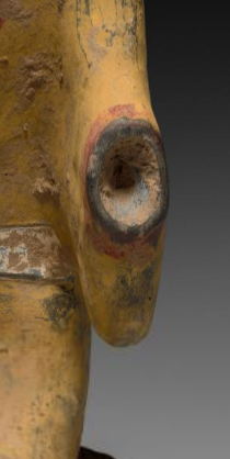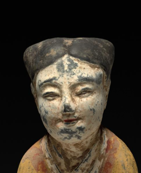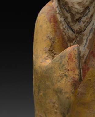 本品规格为33.7 x 25 厘米。整体为陶质,施有彩绘(虽部分彩绘已磨损,但仍可见色彩痕迹)。俑呈跪坐姿态,人物头部戴有黑色冠饰,面部五官刻画较为简洁,神态平和。身着宽袖长袍,衣袍以黄、红等色彩为主,纹饰虽因岁月侵蚀有所模糊,但仍能感受到当时彩绘工艺的细致。俑的手部造型独特,其中一只手臂前伸,手臂端部有孔洞,推测原本可能持有器物,“持物” 的特征由此体现。