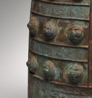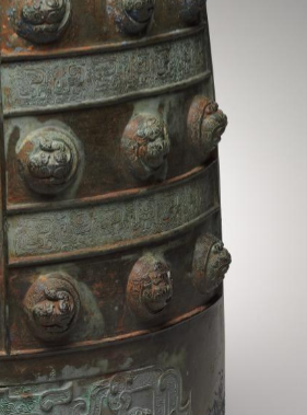 本品规格为41.4厘米。以青铜为材质,整体造型庄重古朴。钟体呈合瓦形,顶部有精美的蟠螭纹钮,螭龙形象盘曲缠绕,线条灵动,尽显工艺之精湛。钟身分布着多层乳钉,排列规整,富有韵律感。钟体表面还饰有蟠螭纹,纹饰细腻繁复,蟠螭身姿矫健、形态各异,在青铜质地与岁月锈迹的映衬下,更显神秘威严。它不仅是东周时期青铜铸造工艺的杰出代表,也承载着当时的礼乐文化内涵,见证了东周时期的艺术与文明风貌。