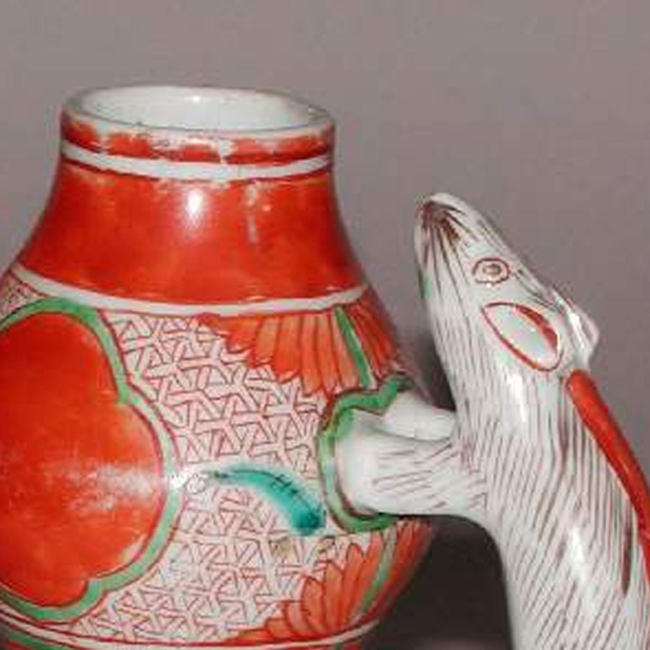 细节:壶身装饰有丰富的图案,包括圆形的红色开光区域,开光外辅以几何纹、花卉纹等纹饰。这些纹饰线条流畅,绘制精细,体现了当时瓷器装饰工艺的水平。流口和执柄的连接处细节处理精致,执柄的动物造型栩栩如生,增加了器物的艺术观赏性。器物表面有一些细微的磨损和划痕,显示出其经历了较长时间的流传。