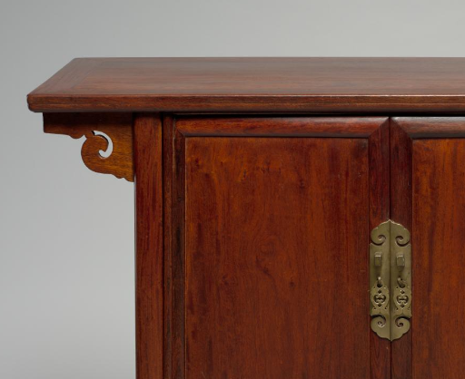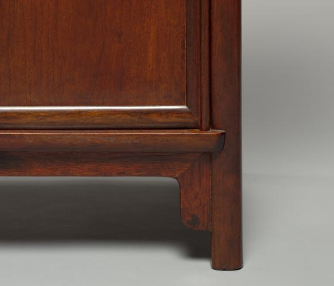 本品规格为83.8 x 43.2 厘米。以珍贵的黄花梨为材质,整体造型简洁大气,尽显明代家具的经典韵味。橱身方正稳重,顶部为平整的台面,可用于摆放器物、陈设装饰。两侧带有精致的牙头装饰,造型优美,既增强了结构的稳定性,又增添了视觉上的灵动与雅致感。柜门采用对开式设计,配有黄铜质地的门环与合页,黄铜的色泽与黄花梨的温润木质相互映衬,古朴中透着精致。黄花梨特有的纹理清晰美观,木质温润细腻,历经岁月更显沉静厚重。整体设计兼顾实用与审美,是明代黄花梨家具中兼具功能性与艺术价值的佳作,体现了明代家具崇尚自然、追求简约而不失细节之美的审美风尚。