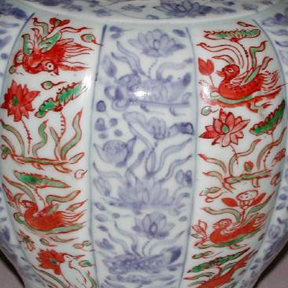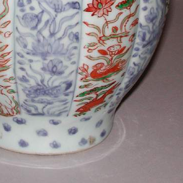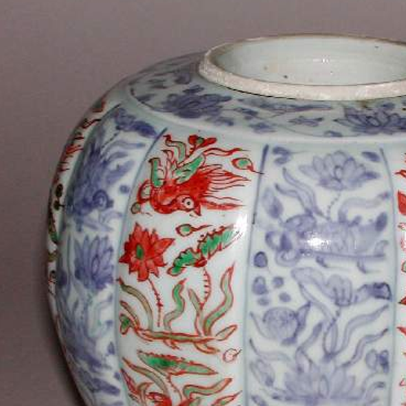 细节:罐身以青花绘制枝叶、花卉等图案作为底纹,五彩描绘的凤凰穿插其中,凤凰造型生动,羽翼舒展,姿态优美。不同瓜棱面的纹饰相互呼应又各有变化,整体装饰繁而不乱,体现了明代工匠高超的绘画技艺和装饰水平。器物表面有一些细微的磨损和使用痕迹,显示出其经历了岁月的洗礼。