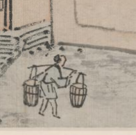 本品规格为31.1 x 41.3 厘米。画面中央,古刹的门庭建筑古朴雅致,屋顶飞檐翘角,结构精巧,门庭周围环绕着高大的树木,树木枝干虬曲,树叶或繁密或疏朗,以深浅不一的墨色与淡彩表现,增添了画面的层次感与自然意趣。树木掩映间,还能看到古刹深处的建筑轮廓,似有一道栅门,更显古刹的幽深与静谧。门庭前的小径上,有一位人物挑着担子行走,姿态生动,为静谧的古刹场景增添了一丝生活气息与动态感。画面左下角还有石制的器物,细节描绘简洁却不失韵味,丰富了画面内容。