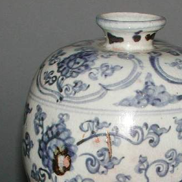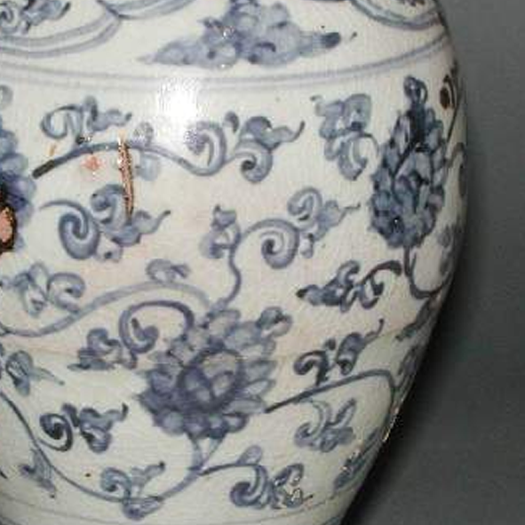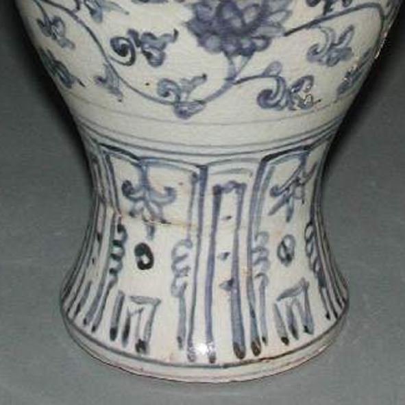 细节:瓶身主体以青花描绘缠枝花卉纹饰,花卉姿态优美,缠枝线条婉转流畅,富有动感。肩部和胫部(底部)装饰有辅助纹饰,肩部可能为卷草纹等,胫部为变体莲瓣纹等,纹饰层次丰富,布局疏密得当。瓶身有一些细微的磨损、小的磕痕和釉面剥落现象 ,显示出其经历了长时间的流传和使用。