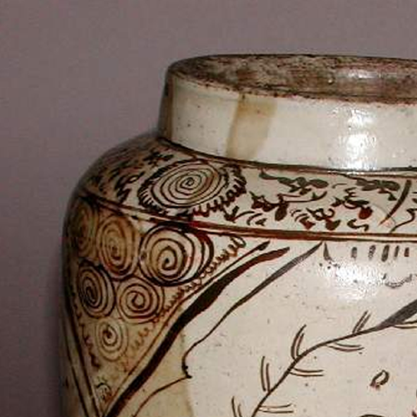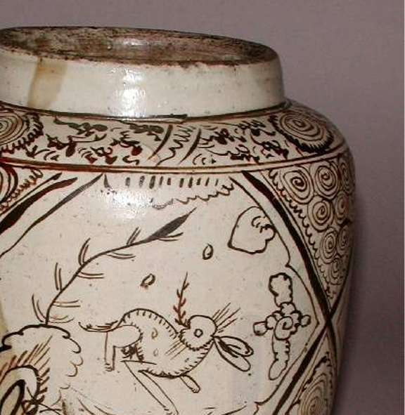 细节:罐身以菱形开光的形式分隔画面,不同开光内分别绘制有兔子、仙鹤等动物形象,动物造型简洁生动,寥寥几笔便勾勒出其形态特征。开光外装饰有卷草纹、螺旋纹等辅助纹饰,线条流畅,布局合理。罐体表面有一些细微的磨损、污渍以及开片现象,显示出其经历了漫长岁月的流传。