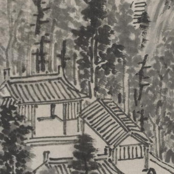 本品规格为31.1 x 41.3 厘米。画面中,山居建筑错落分布,屋顶线条古朴流畅,屋舍结构精巧,木质纹理与门窗细节虽简笔勾勒,却也透出明代建筑的典雅韵味。建筑依傍山势而建,周围环绕着茂密的树木,各类树木枝干虬曲、枝叶疏密有致,以浓淡不一的墨色表现,营造出清幽静谧的山林氛围。山石嶙峋,与树木、建筑相互映衬,更显山居环境的自然野逸之美。远处还能看到溪流蜿蜒,为画面增添了灵动的水乡气息。