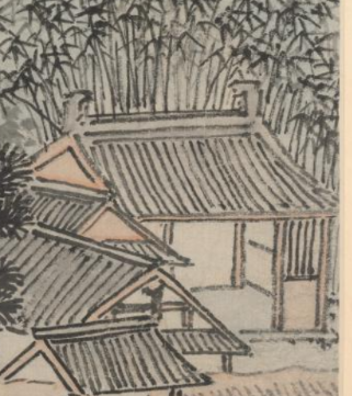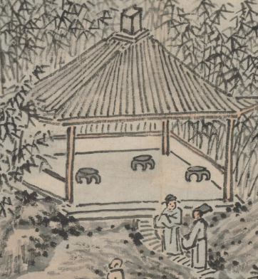 本品规格为31.1 x 41.3 厘米。大片茂密的竹林占据画面上方,竹子以劲挺的线条勾勒,竹叶层次分明,营造出清幽静谧的氛围。竹林掩映下,一座亭阁伫立,亭顶构造简洁,亭内摆放着几案,似为文人相聚交流之所。下方,几座屋舍错落分布,屋舍造型古朴,与周围自然景致和谐相融。还有蜿蜒的小径,顺着地势延伸,增添了画面的空间感与生活气息。画面中有数位人物,或在亭阁附近交流,或行走于小径之上,人物姿态各异、神情悠然,生动展现出文人雅集时的闲适与自在,仿佛能让人感受到他们谈诗论画、畅叙幽情的场景。