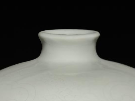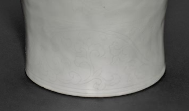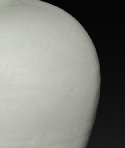 本品规格为直径20.3厘米,高度32.1厘米。造型为典型的梅瓶样式,小口、短颈、丰肩,腹部以下逐渐收窄,线条流畅优美,尽显端庄典雅之态。其釉色呈甜白釉,白润莹洁,如羊脂般细腻,给人一种温润甜腻的视觉与触觉感受,这是明代甜白釉瓷器的典型特征,体现出当时高超的制釉工艺。瓶身采用暗刻工艺装饰花纹,花纹虽不张扬,需仔细观察方能领略其精妙,但线条婉转流畅,图案布局规整,与纯净的甜白釉相互映衬,更显素雅含蓄之美,将明代瓷器追求简约而不失精致的审美风尚展现得淋漓尽致,是明代甜白釉瓷器中兼具艺术价值与工艺价值的代表器物。