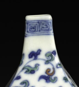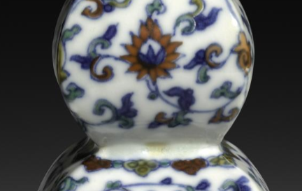 本品规格为8.8厘米。造型为经典的葫芦形,上下两部分比例协调,线条流畅自然,给人以圆润饱满之感。瓶身以斗彩工艺装饰,色彩丰富且搭配和谐,有青花、红、绿、黄等色。缠枝莲纹婉转缠绕,花朵形态优美,花瓣、花蕊等细节刻画精致,枝叶舒展灵动,整体纹饰布局疏密得当,充满生机与韵律。