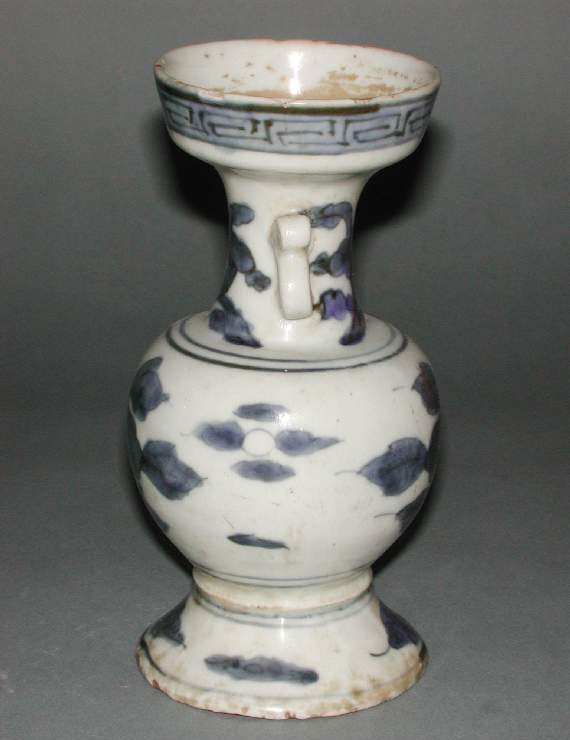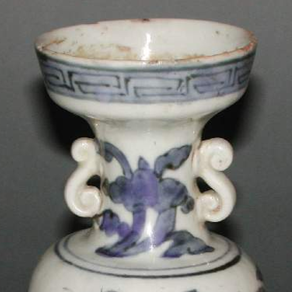 整体造型:敞口,长颈,鼓腹,高圈足外撇,颈部两侧对称装饰有弯曲的如意形耳,增加了器物的美感与灵动性。整体造型线条流畅,比例协调,具有明代瓷器典雅秀美的风格特点,适合作为陈设器使用。