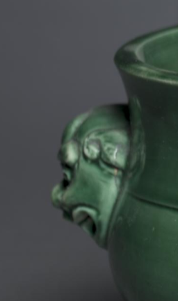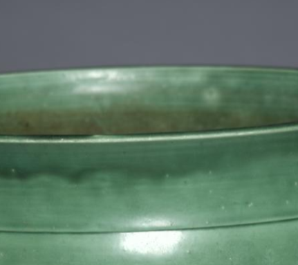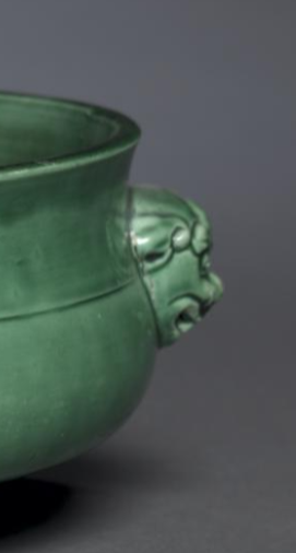 本品规格为直径23.4厘米,高度9厘米。造型为鼓腹、圈足,整体线条圆润饱满,给人沉稳庄重之感。炉身施绿釉,釉色浓郁鲜亮,如翡翠般温润,釉面光洁,质感细腻,尽显明代绿釉瓷器的工艺特色。炉的两侧装饰有铺首耳,铺首以兽首为造型,雕刻细致,神态生动,既增添了器物的装饰性,又便于提拿或陈设时的固定,体现出实用与美观的结合。