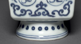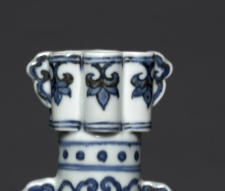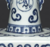 本品规格为10.7厘米,高度26厘米。造型别致,由瓶身、双耳等部分构成。瓶身主体呈方形,线条规整,展现出稳重之感;颈部修长,顶端为花口设计,增添了几分灵动与精美。两侧配有双耳,耳的造型精巧,与瓶身衔接自然,既具装饰性,也方便握持或陈设时的搭配。瓶身以青花为饰,青花发色浓淡相宜,色泽沉稳雅致。纹饰布局讲究,颈部及瓶身绘制有阿拉伯文,字体规整且富有韵律,周围辅以卷草等纹饰,线条流畅婉转,与阿拉伯文相互映衬,整体装饰既体现了中国传统青花瓷的工艺特色,又融入了阿拉伯文化元素,是明代中外文化交流在陶瓷艺术上的生动体现。