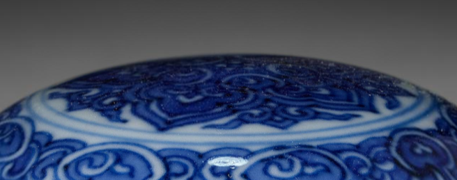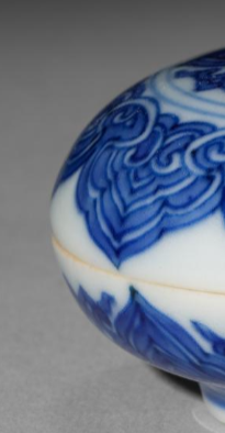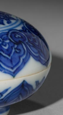 本品规格为直径5.8厘米,高度3.4厘米。造型圆润饱满,呈扁圆形,由盖与盒身相扣合而成,整体线条流畅自然,给人一种规整且雅致的感觉。盖盒以洁白的瓷胎为底,通体施青花釉。青花发色浓艳明快,层次分明。盖面及盒身饰有精美的花卉纹样,纹饰以传统的卷草、缠枝等花卉元素为主,线条勾勒细腻流畅,图案布局疏密得当,既展现出花卉的柔美姿态,又富有韵律感。青花的蓝色与洁白的瓷胎相互映衬,色彩对比鲜明,更凸显出纹饰的精美与瓷器的温润质感。