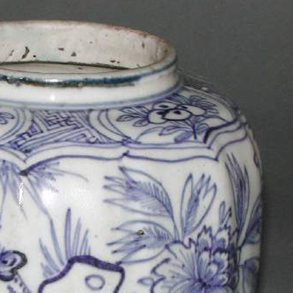 整体造型:直口,短颈,丰肩,鼓腹,圈足,整体造型圆润饱满,线条流畅,具有典型的明代中晚期罐类器物的造型特点,既实用又具备一定的陈设观赏价值。