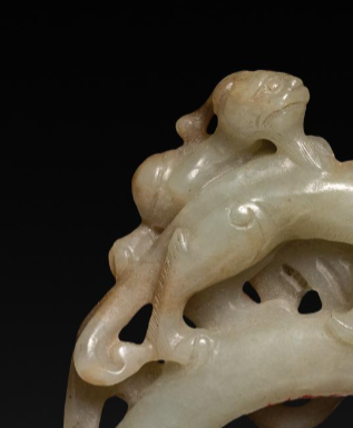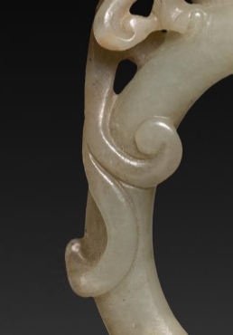 本品规格为6.4厘米。以温润的青白玉为材质。整体呈环形,造型精巧别致。环身之上雕刻有灵动的螭龙,螭龙形态矫健,身姿缠绕于环体,细节刻画细腻,龙首神态威严,龙身线条流畅自然,辅以卷曲的云纹等装饰,增添了灵动之感。玉石质地莹润,虽历经岁月,仍能感受到其细腻的质感与光泽,展现出南北朝时期玉器雕刻工艺的精湛,也体现出当时对螭龙等神兽形象的喜爱与推崇,是兼具艺术价值与文化内涵的玉器珍品。