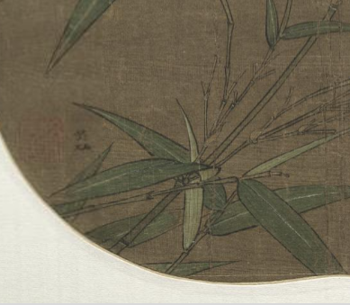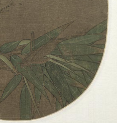 本品规格为24.8 x 26.8 厘米。聚焦“竹”与“虫”的局部特写,采用宋代花鸟画“折枝”构图法(类似特写镜头),突出表现竹枝形态、竹叶色泽与昆虫动态,引导观者细细品赏。竹枝竹叶以双钩技法勾勒,线条苍劲凝重、顿挫起伏,精准表现竹枝老节劲、竹叶坚的质感;色彩上,竹叶敷以青翠石绿,叶尖微染黄,生动呈现秋天叶片渐枯的自然变化;昆虫部分以细致柔和的线描勾勒,再用墨色晕染,让昆虫形态逼真传神,尽显画家深厚写生功力。