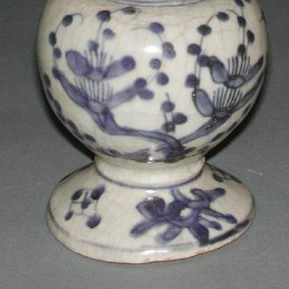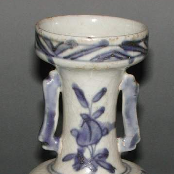 细节:口沿处装饰有简单的几何纹,颈部和腹部以青花描绘花卉图案,花卉形态生动,枝叶舒展,花朵或含苞或盛放,展现出自然的美感。双耳造型简约,与瓶身衔接自然。器物表面可见细微的磨损、小的磕痕以及开片现象,显示出其经历了长时间的流传。
