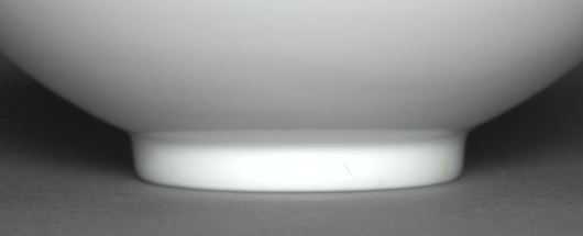 本品规格为直径11.6 厘米,高度5.4厘米。造型规整,呈敞口、弧腹、圈足的经典碗式。整体以纯净的白色为基调,釉色洁白莹润,如凝脂般细腻光滑,给人一种素雅洁净之感。釉面均匀平整,光泽柔和,虽无繁复纹饰,却凭借简洁的造型与温润的釉色,尽显清代白釉瓷器 “素面朝天” 的美学特质,体现出清代制瓷工艺对纯色釉瓷器质感与色泽把控的高超水准,是清代白釉瓷器中兼具实用与艺术价值的典型器物。