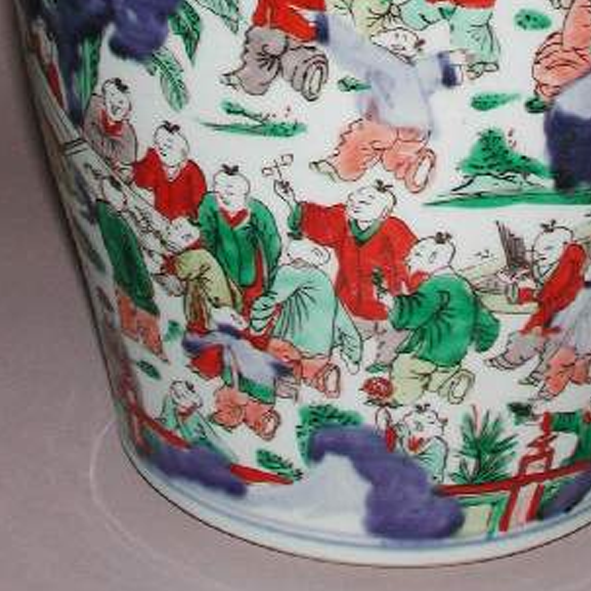 细节:罐身和盖子上满饰婴戏纹,描绘了众多孩童嬉戏玩耍的场景,有的放风筝,有的斗蟋蟀,有的读书,有的嬉戏打闹,形态各异,天真可爱。周围衬以树木、山石、花卉、亭台楼阁等元素,丰富了画面的层次感。纹饰绘制精细,人物表情生动,色彩搭配和谐,体现了明代工匠高超的绘画技艺。器物表面有一些细微的磨损、小的磕痕以及釉面剥落现象,显示出其经历了长时间的流传。
