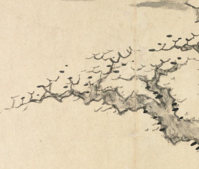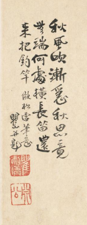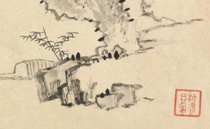 本品规格为28.6 x 44 厘米。画面中,一株老树虬枝旁逸,枝干苍劲嶙峋,叶片稀疏,尽显秋意萧索。树下怪石错落,更添几分古朴野趣。背景云雾淡远,与孤树怪石相映,左侧题诗与印章,丰富了画面的文化意蕴。整体笔墨简淡空灵,将秋日黄山树石的孤绝之态刻画得精妙,传递出清寂悠远的意境,体现出梅清独特的艺术审美与对黄山秋景的细腻感悟。