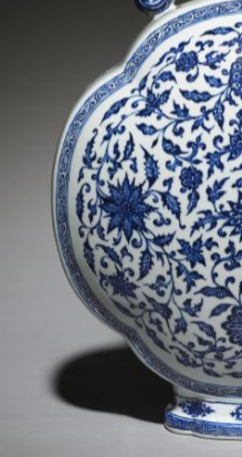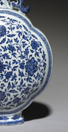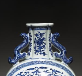 本品规格为49.2 x 35.5 厘米。造型为扁圆形,瓶颈两侧装饰有对称的双耳,线条优美流畅,增添了器物的灵动之感。瓶身以洁白的瓷胎为底,采用青花工艺绘制缠枝花卉纹,青花发色浓淡相宜,层次丰富。缠枝花卉纹繁复且富有韵律,花朵形态各异、栩栩如生,枝叶缠绕蔓延,充满生机与活力,展现出清代青花瓷器在纹饰绘制上的精湛技艺。整体器型端庄典雅,青花与白瓷相互映衬,既体现出清代瓷器制作的高超水准,又散发着古典雅致的艺术韵味,是清代青花瓷器中颇具代表性的佳作。