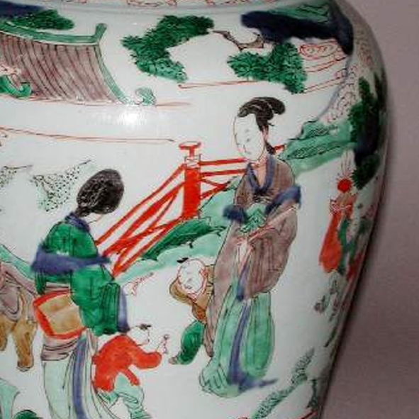 细节:罐身与盖面满绘人物故事纹饰,描绘了众多人物于庭院、山水间活动的场景,有的仕女闲庭信步,孩童嬉戏玩耍,人物身着清代服饰,姿态各异,神情生动。周围衬以亭台楼阁、树木山石、桥梁栏杆等,还点缀有彩云纹饰,画面层次丰富,布局疏密得当。纹饰绘制精细,色彩搭配和谐,体现了清代工匠高超的绘画技艺。器物表面有细微磨损、小磕痕及釉面剥落现象,显示出其流传已久。