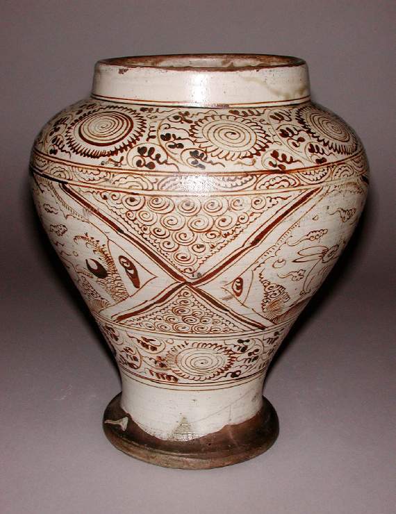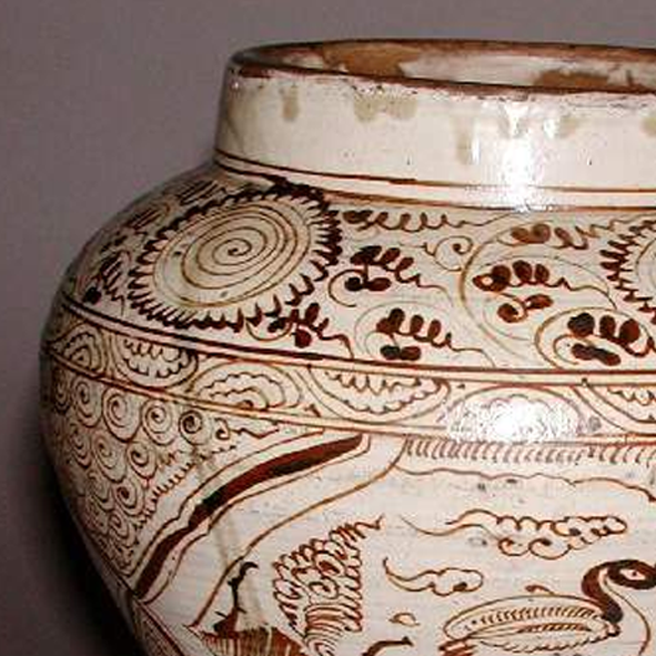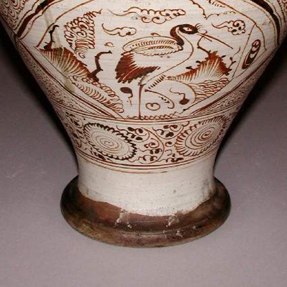 细节:罐身上部和下部装饰有连续的几何纹、花卉纹带,线条流畅,富有韵律感。腹部以褐彩描绘花鸟图案,如仙鹤在花草间伫立等,画面生动,笔触简洁却富有表现力,体现了宋代磁州窑工匠高超的绘画技艺。器物表面有一些细微的磨损、污渍以及小的开片现象,显示出其经历了长时间的流传。