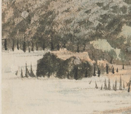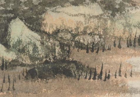 本品规格为25.5 x 20.2 厘米。画面营造出静谧悠远的氛围。近景是水域,岸边生长着一些低矮的植物,增添了自然生机。中景与远景处,山丘连绵,山上树木枝干光秃,呈现出秋季的萧瑟之感,其间矗立着残垣,在秋林的映衬下,更显历史的沧桑与岁月的痕迹。