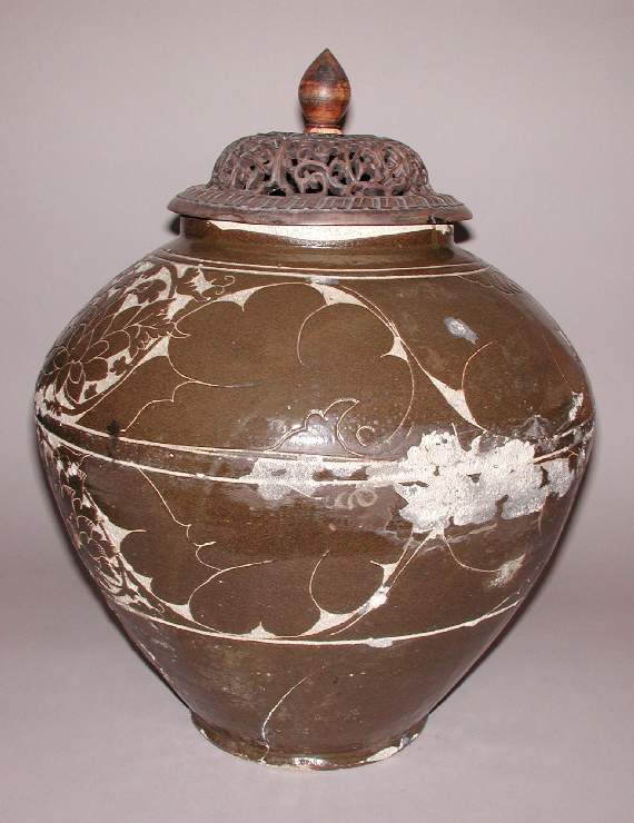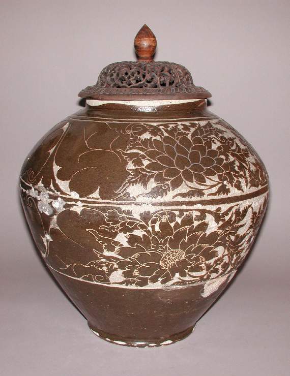 褐釉剔花花卉纹盖罐(配木雕镂空盖)