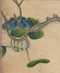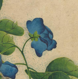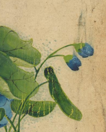 本品规格为14.4 x 20.3 厘米。画面里,蓝色花朵明艳动人,或盛放或含苞,花瓣色泽浓郁且富有层次感。翠绿的叶片形态饱满,叶脉清晰,与蓝色花朵相互映衬,尽显生机与柔美。枝干曲折伸展,纹理细腻,为画面增添了自然的意趣。背景为古朴的浅色调,更凸显出蓝花与翠叶的艳丽与雅致,整体画面传递出一种清新雅致的气息,展现出张若霭在花卉题材绘画上对色彩与形态的精妙把握,尽显清代宫廷绘画的细腻与典雅。