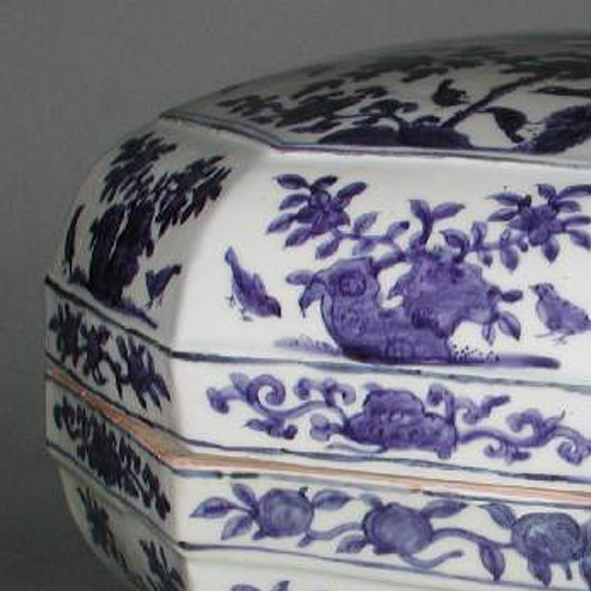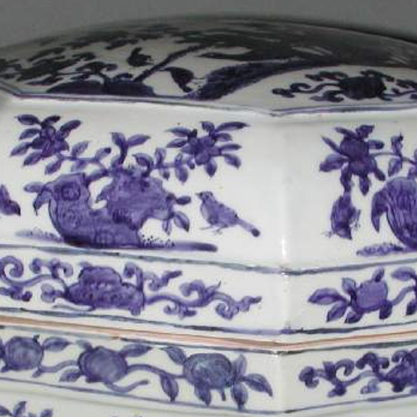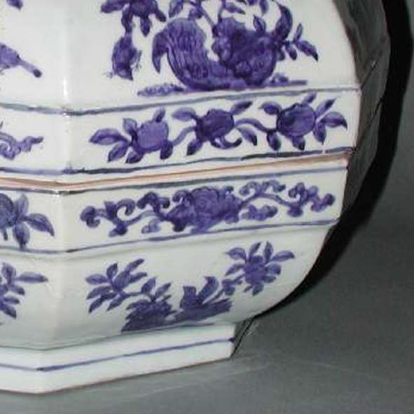 明代是中国青花瓷器发展的鼎盛时期,景德镇作为全国制瓷中心,生产规模庞大,工艺精湛。青花瓷的纹饰题材丰富多样,花果纹是常见的装饰题材之一,寓意丰收、美满。明代的瓷器制作不仅满足国内市场需求,还大量出口到海外,对世界陶瓷艺术的发展产生了深远影响,成为中外文化交流的重要载体。同时,明代的手工艺制作注重造型与装饰的结合,八角形盖盒这种独特的造型,体现了当时工匠的创新精神和审美追求。