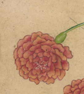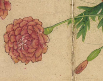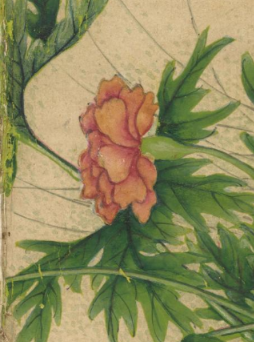 本品规格为14.4 x 20.3 厘米。画面中,几簇花卉色彩明艳,花朵饱满圆润,呈现出柔和的粉橘色调,花瓣层次丰富,细腻的笔触将花蕊的精致也刻画出来。翠绿的叶片形态舒展,叶脉清晰,与花朵相互映衬,尽显生机与柔美。背景为古朴的浅色调,更凸显出花卉的艳丽与雅致,整体画面传递出一种烂漫鲜活的气息,展现出张若霭在花卉题材绘画上对色彩与形态的精妙把握,尽显清代宫廷绘画的细腻与典雅。