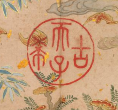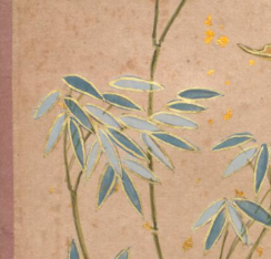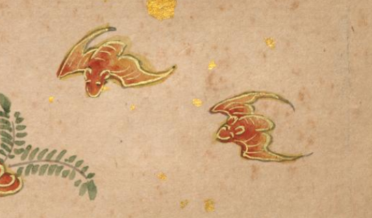 本品规格为14.4 x 20.3 厘米。竹叶以清新的蓝绿色绘就,边缘勾勒出金色线条,在古朴的底色衬托下,显得雅致且富有华贵感。竹叶形态舒展,脉络隐约可见,竹枝纤细却挺秀,整体展现出翠竹的清丽之姿,与册页中石、云、蝠等元素相呼应,共同营造出兼具雅致与祥瑞寓意的画面氛围,尽显清代宫廷绘画的细腻工致与文化内涵。