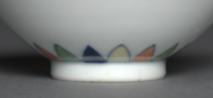 本品规格为8.8 厘米。造型为撇口、弧腹、圈足,整体线条流畅自然。碗身以洁白的瓷胎为底,胎质细腻。碗的外壁近足部,以斗彩工艺绘制出莲瓣纹,色彩丰富,有红、绿、蓝、黄等色,莲瓣形态规整,色彩搭配和谐,为素雅的碗身增添了灵动与艳丽之感。斗彩工艺的运用,使得釉下青花与釉上彩相互映衬,工艺精湛,展现出清代斗彩瓷器制作的高超水准,具有较高的艺术与历史价值,是清代斗彩瓷器中颇具代表性的器物之一。