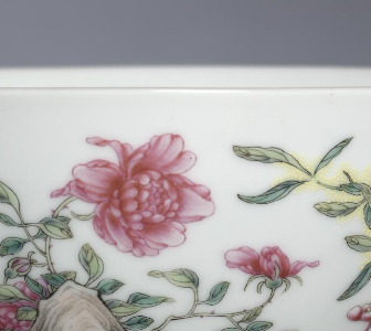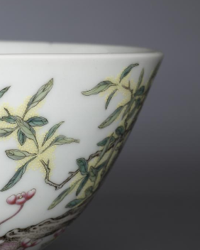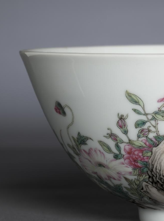 本品规格为直径14.1厘米,高度6.6厘米。造型规整,碗身线条流畅。以洁白的瓷胎为底,采用粉彩工艺绘制纹饰。画面中,粉色的花卉娇艳欲滴,花瓣层次分明,色彩过渡自然柔和;绿色的枝叶舒展灵动,叶脉清晰可见;还有形态古朴的洞石,纹理刻画细腻,与花卉相互映衬。整体色彩搭配和谐,粉彩的晕染技法精湛,将花卉的柔美、洞石的苍劲都展现得淋漓尽致,既具实用价值,又彰显出清代粉彩瓷器高超的艺术水准与雅致的审美意趣。