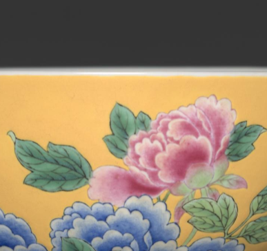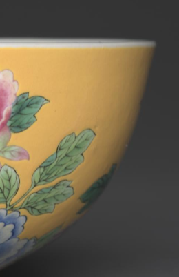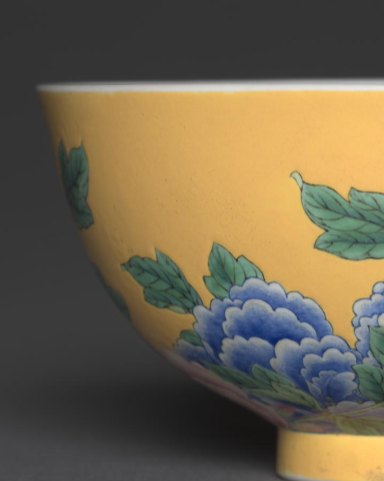 本品规格为直径12.4厘米,高度6.2厘米。以明亮的黄色为底,色彩鲜艳夺目。碗身绘制有精美的粉彩牡丹纹饰,粉色与蓝色的牡丹花朵娇艳饱满,搭配翠绿的叶片,色彩搭配和谐且富有层次感。牡丹花瓣的纹理、叶片的脉络都通过细腻的粉彩技法细致描绘,生动逼真,尽显牡丹的雍容华贵之态。碗的造型规整,口沿圆润,底部为圈足,整体工艺精湛,既体现了清代粉彩瓷器制作的高超技艺,又借助牡丹这一传统吉祥纹样,传递出富贵、繁荣的美好寓意,是清代粉彩瓷器中兼具实用与艺术价值的精品。