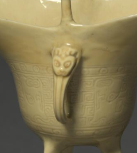 本品规格为13.4 x 14.2 厘米。造型模仿古代青铜爵,整体线条流畅且富有古韵。它以黄釉为饰,釉色淡雅温润,如凝脂般细腻,釉面光洁,质感柔和,尽显清代黄釉瓷器的工艺特色。爵身带有精美的纹饰,线条细腻,刻画工整,虽为仿青铜样式,却融入了清代制瓷工艺的细腻风格。三足设计稳定支撑,两侧有柱,还有兽首形鋬(把手),细节处精致考究,既保留了青铜爵的古朴庄重,又展现出清代瓷器在仿制古器时的创新与精湛技艺。
