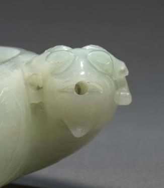 水丞是传统文房四宝(笔、墨、纸、砚)的辅助工具,主要用于贮存砚水。在清代文人研磨时,需要往砚台中加水 ,这件青玉水丞便可用来储存一定量的清水,并通过兽首处的开口, 精准地将水滴入砚台,以控制墨汁的浓淡,满足书写、绘画对墨色的需求。