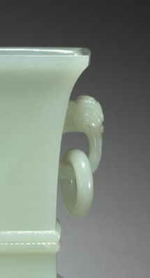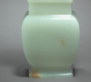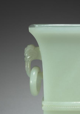 本品规格为14.4 厘米。以温润的青玉雕琢而成,色泽淡雅莹润,质地细腻。整体呈方形,造型规整端庄。尊的两侧装饰有双兽耳,兽首雕刻精致,神态灵动,耳部悬挂着活环,环体圆润,与兽耳搭配和谐,增添了器物的灵动之感。器身中部有一圈类似绳纹的装饰带,线条流畅,丰富了视觉层次。底部为方形,与整体的方正规格相呼应,底部还带有自然的玉色沁斑,更显古朴韵味。整件器物工艺精湛,将青玉的天然之美与人工雕琢的精巧完美结合,既体现了清代玉器制作的高超技艺,也展现出典雅庄重的艺术风格,是清代玉器中的精品之作。