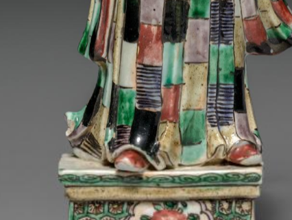 本品规格为29.9厘米。整体为站立姿态,人物形象刻画细致。文官头戴冠帽,面容平和,长髯垂落,尽显儒雅风范。其身着的长袍采用五彩工艺装饰,色彩丰富艳丽,以绿、红、黄、黑等色彩构成方格图案,衣袍上还绘有精美的纹饰,增添了华丽感,衣纹线条流畅自然,很好地展现出衣物的质感与飘逸的形态。