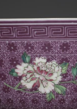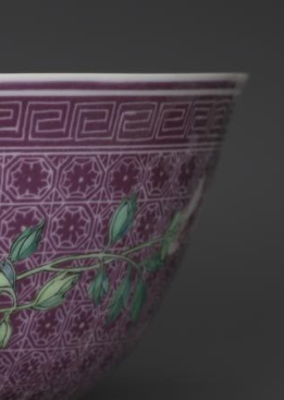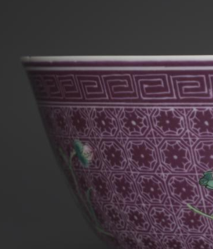 本品规格为直径15.5厘米,高度7.6厘米。造型规整端庄,碗口微敞,弧壁下收,圈足规整。碗身以浓郁雅致的胭脂紫色为地,色彩沉稳且富有层次感。其上以粉彩精心绘制缠枝牡丹纹饰,牡丹花朵形态饱满,花瓣层次分明,粉色与白色相互晕染,尽显牡丹的雍容华贵之态;翠绿的枝叶缠绕延伸,叶脉清晰,鲜活生动,与花朵相得益彰。碗的口沿处饰有回纹,底部圈足周围则有卷草纹,纹样细腻规整,与主体的牡丹纹饰相互映衬,整体构图和谐。粉彩工艺运用娴熟,色彩搭配协调,将牡丹的柔美与底纹的典雅完美融合,既展现出清代粉彩瓷器制作的高超技艺,又传递出富贵吉祥的美好寓意,是清代粉彩瓷器中兼具实用与艺术价值的精品。