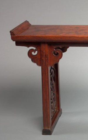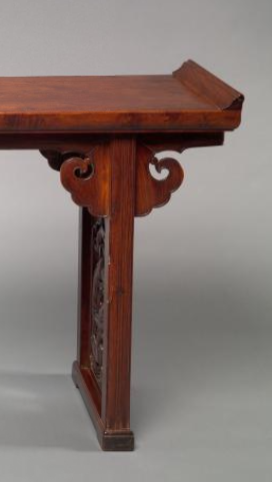 在清代时,在传统的家族祭祀、宗教仪式中,翘头案常被摆放在祠堂、庙宇 等庄重的场所。人们会在案面上摆放香炉、烛台、供品等,用于祭祀祖先、神灵,表达对先人的缅怀和对神灵的敬畏。