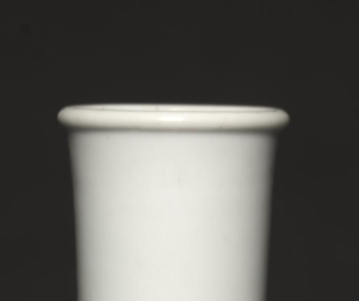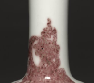 本品规格为直径10.5厘米,高度17.8厘米。造型独特,呈细长颈、丰肩、敛腹的形态,整体线条流畅,酷似摇铃,故而得名。尊身以洁白的瓷胎为底,施釉匀净莹润。装饰采用釉里红工艺,在颈部与肩部绘有红色的纹饰,色泽温润,红彩与白釉相互映衬,对比鲜明。釉里红的纹饰似卷曲的云纹或蔓草纹,线条婉转灵动,虽布局简洁,却通过色彩与线条的搭配,展现出古朴雅致的艺术韵味。