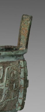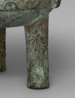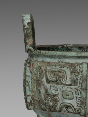 本品规格为24.5 x 20 厘米。鼎身呈圆形,口沿上有两个直立的耳,方便搬运或悬挂。鼎身装饰着典型的商代兽面纹,纹饰线条繁复、古朴神秘,兽面的双目突出,给人一种威严、神秘的感觉,体现了商代青铜器高超的铸造与装饰工艺。鼎下设三个柱形足,既稳固了鼎的整体结构,又与鼎身的庄重风格相契合。青铜材质历经岁月,表面呈现出斑驳的绿锈,更增添了历史的厚重感,它不仅是商代重要的礼器,也承载着当时的文化与信仰内涵。
